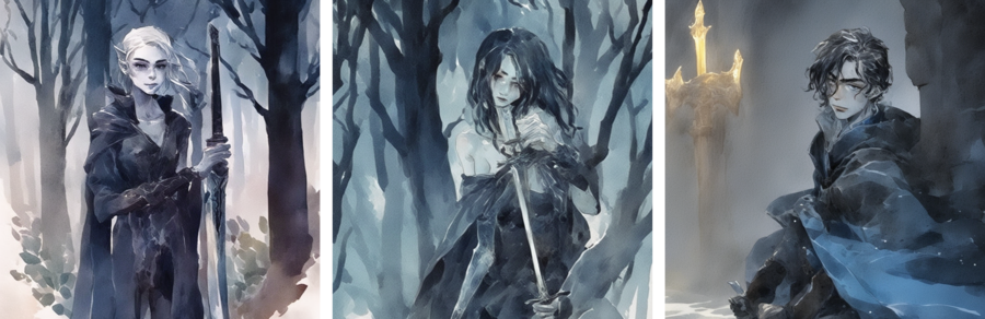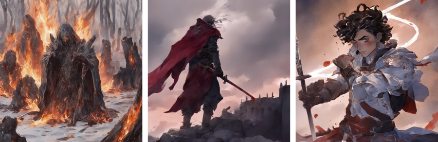Он всегда мечтал стать героем. В королевском саду маленький принц размахивает деревянным мечом, отражая невидимые атаки. В глазах — азарт, на щеках — румянец. Он верит, что однажды защитит своё королевство. В ту ночь дворец охватило пламя, а коридоры заполнились шёпотом предательства. Теперь он идёт сквозь холодный лес, его пальцы сжимают старый меч. И вот в ночной буре, среди всполохов магии, он стоит с мечом, который искрит в его руках. Взгляд сосредоточен, но в глубине глаз — тень сомнений. Спустя годы скитания от былого величия осталась лишь тень прошлого. Доспехи потускнели, взгляд стал тяжёлым. В его руках — алый цветок, распустившийся в развалинах старого замка, последний символ того, что он потерял.