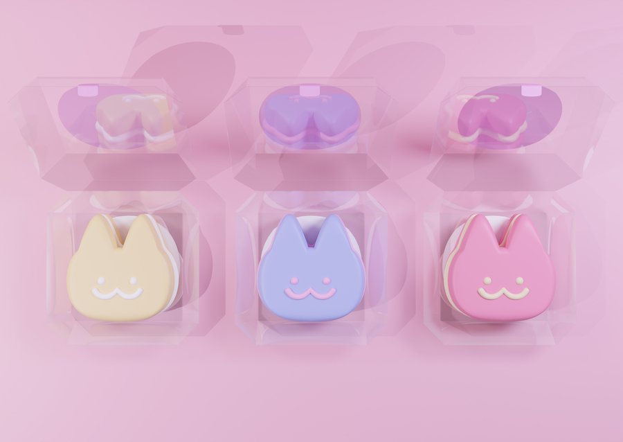 Promt: Design Whipped Dreams cakes for the MIO brand. The cakes should be small, light, with a soft texture and a delicate milk flavour reflecting the milkshake theme. Offer several flavour options (e.g. vanilla, strawberry, caramel) with matching pastel colours and decorations. The design should be minimalist and elegant, using rounded shapes and pastel colours that reflect the brand’s style. Discreetly incorporate elements reminiscent of a whipped cream cat (MIO’s mascot) into the design. Consider individual and group packaging options (e.g. elegant boxes or individual parchment paper mini-packs). Prioritise airy, delicate and premium designs.