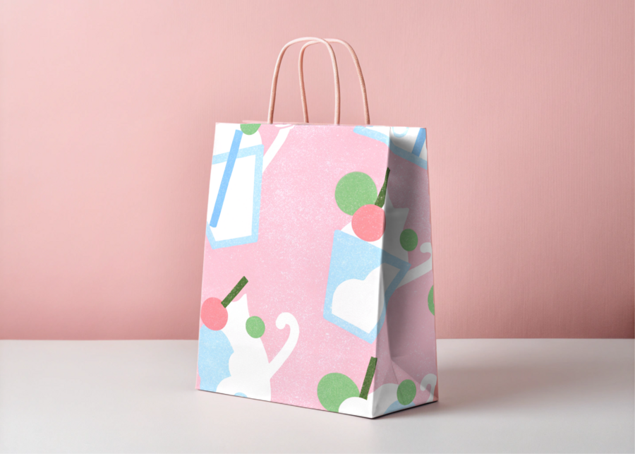 2. Запрос в чат GPT: напиши описание иллюстрации для повторяющейся выкройки для упаковочных пакетов кафе «MIO» для пирожных. Тематика бренда — молочные коктейли в необычных стаканах-шейкерах, маскот бренда — белый кот, состоящий из воздушных сливок.