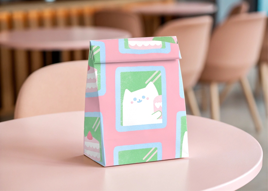 2. Promt: Funny repeating pattern with small images of a white cat made of whipped cream playing among miniature cakes. The cat keeps peeking out from behind the cakes, creating a playful mood. The pattern is in pastel colours with small bright accents reflecting the colours of the cakes.
