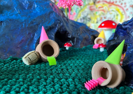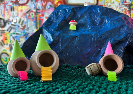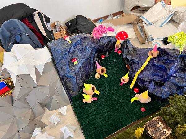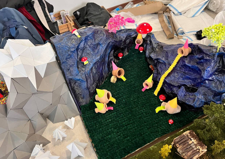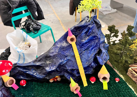 «Дача пропадающих в детстве» — это часть совместного проекта «Омнитаун». Представляет собой платформу, покрытую пряжей эмитирующую траву, на которой расположены горы, дома-горшки, большие грибы и прочие атрибуты дач.