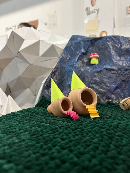 Проект выполнен минималистично, в необычной для дач палитре, с целью показать мир глазами ребёнка, когда всё вокруг было ярче, проще и таинственнее. Жители этой дачи живут в грёзах о детстве и мечтают вернуться в него, пытаются вести себя по-ребячьи, перекладывают свою ответственность на других, делают всё, чтобы максимально приблизиться к тому как было раньше. Но, к сожалению для них, вернуться в детство невозможно, по этому я использовал в качестве домов глиняные горшки. Это метафора, говорящая о безумии этих людей, которые закрылись от внешнего мира и пытаются достичь невозможного, тратя свою жизнь в пустую. То есть — живут в горшках.