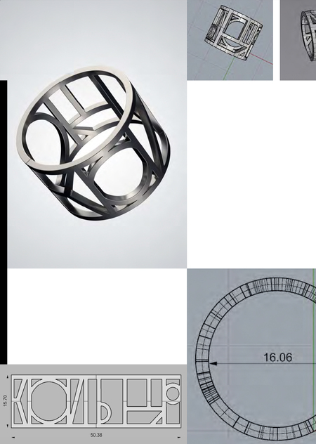 В этом проекте представлено ювелирное украшение «Кольцо», выполненное из серебра с последующим родированием. Кольцо является первым объектом серии ювелирных украшений, в которых «Слово» теряет свой вес и выступает в качестве основы для самого объекта. В коллекции планируется выпустить серги со словом «Серьга», браслет со словом «Браслет» и кулон со словом «Кулон».