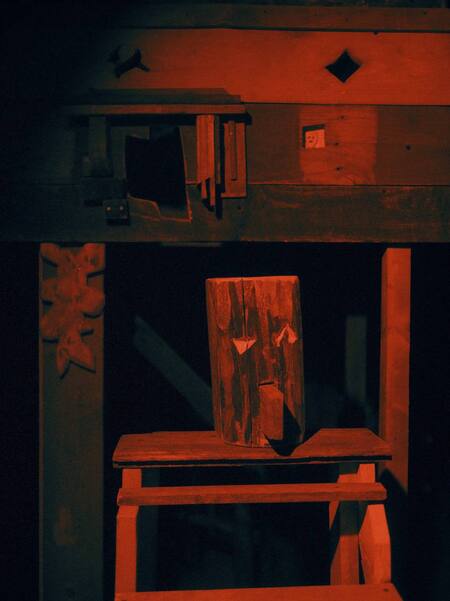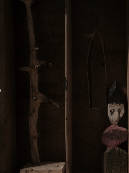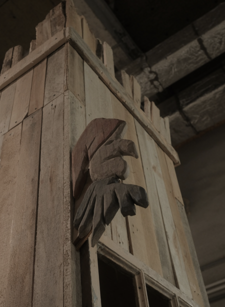 Как герой оказывается в новой деревне в ходе символического паломничества в поисках инициации? Подобно ему, зритель преодолевает входные ворота, которые вводят в новосозданный город. Этот город окутан ненавязчивым розовым оттенком, который направляет по деревянным лестницам исключительно вверх. По мере продвижения за зрителем наблюдают вымышленные фигуры, отделенные стеклянными перегородками, в то время как некоторые персонажи погружены в переживание собственных страстей.