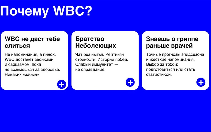 WBC — это умный трекер здоровья, который напоминает о приеме лекарств, гигиене и лечебных процедурах, а также предупреждает пользователей о вспышках заболеваний в их районе.