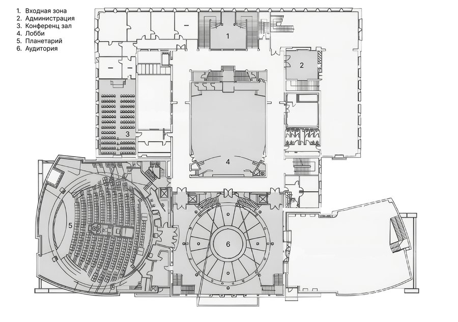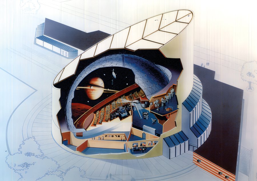 Навигация по планетарию выстраивалась по определенной философии — чтобы посетитель мог ориентироваться в здании планетария также хорошо, как и космонавты в пределах космической станции.