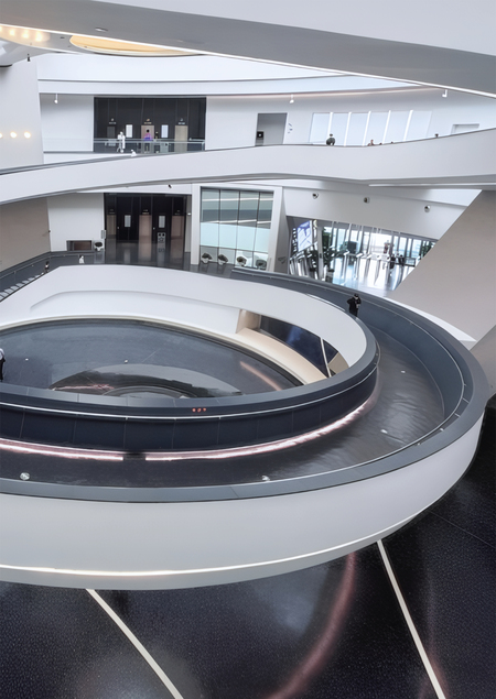 Входную зону, венчают прямоугольные колонны, которые объединяют двусветное пространство в единый ансамбль, что подчеркивается белоснежными лестницами с черной окантовкой и лифтом, расположенным между ними. На этом этаже гости планетария могут отдохнуть на комфортных пуфах лобби или же приобрести билеты на ресепшене.