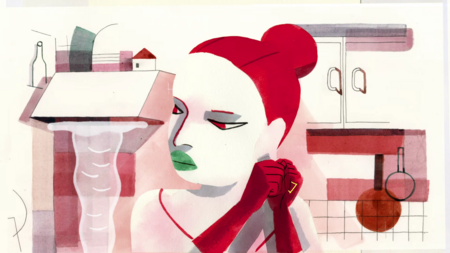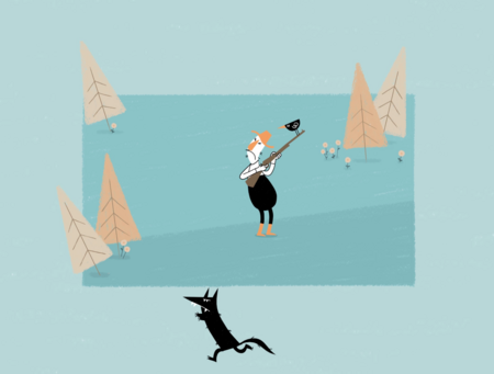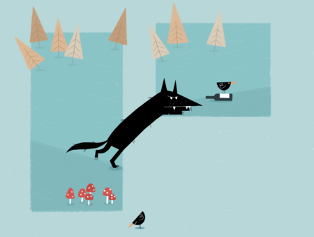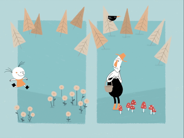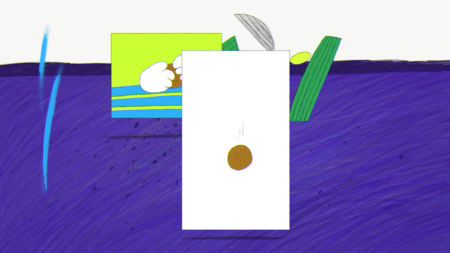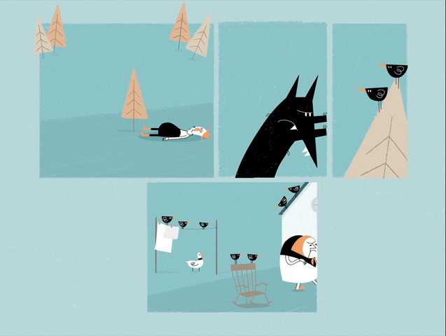 Мультфильм «Merlot» Джулии Мартинелли и Марты Дженнари иллюстрирует в полной мере возможности использования полиэкрана в анимации. Во-первых, события из разных композиций влияют друг на друга: например, в эпизоде ниже чихание «пошатнуло» мир охотника и оно буквально сбивает охотника с ног.