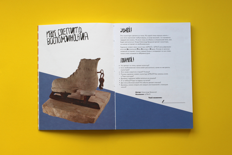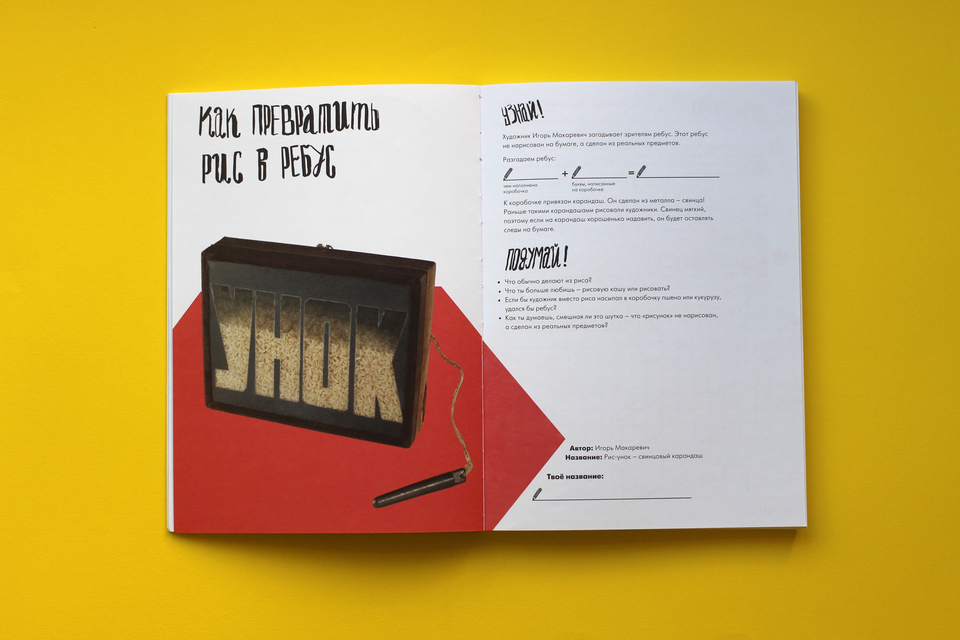 The publication is a mini-catalogue of the PERMM Museum of Modern Art, produced in a sketch-bok format, a creative notebook that familiarizes a child with unusual works of art by contemporary artists.