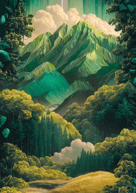 Prompt: a cap with with intricate details, mountains, forest and magic, in green and yellow color pallet, on a solid background