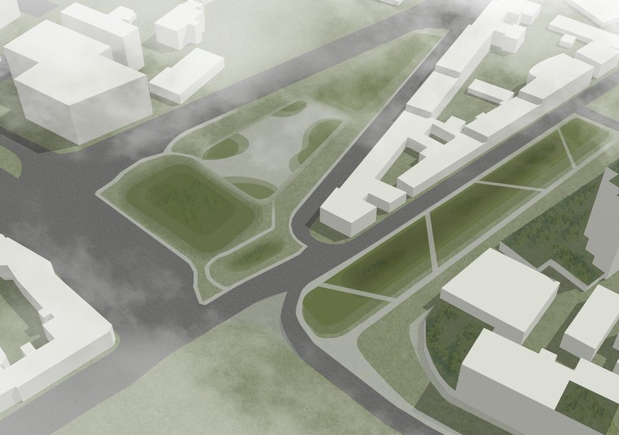 Концепция предполагает озеленение кровли зданий, имеющих плоскую крышу. Такое решение не только позволит создать необходимое количество новых парковочных мест, но и станет определенной отличительной особенностью, а также подчеркнет взаимосвязь новых парковых зон.