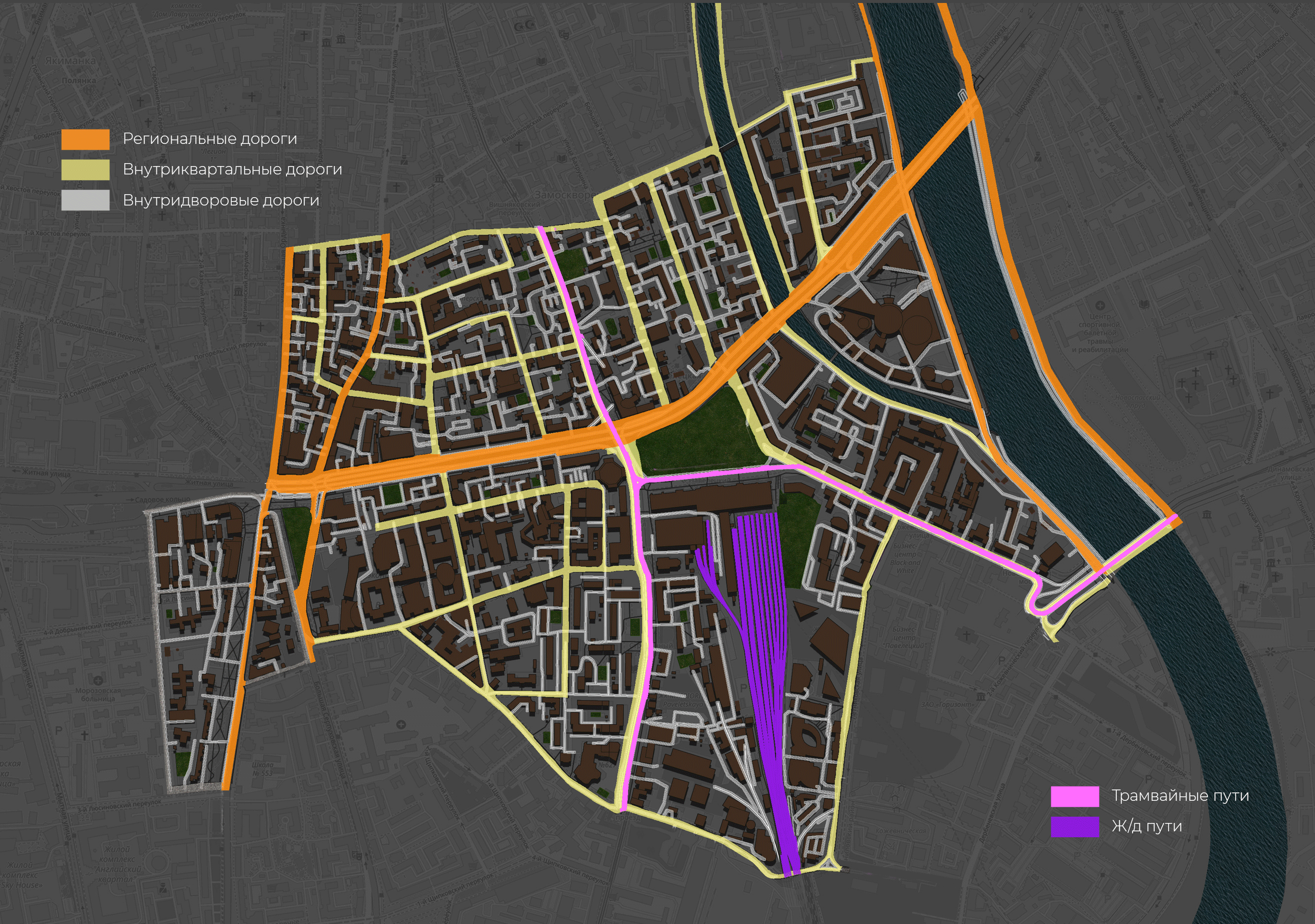 Во время анализа территории в разные века и года было отмечено, что основные пути с определенного момента не менялись, главные дороги всегда имели определенное местоположение, что говорит о необходимости в данном проекте благоустройства подчеркнуть исторически сложившиеся пути, но создать «направляющие» для жителей и гостей района в виде новых точек притяжения.