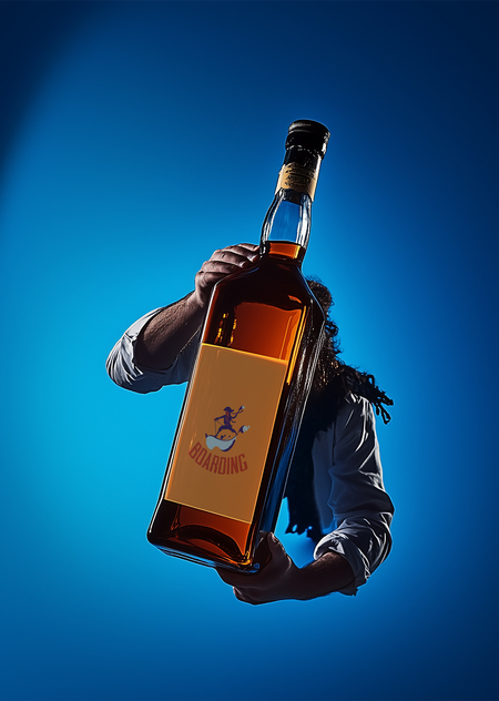 Модель: Midjourney v 6.0 Стиль: Photography Theme Промпт: A simple, three-dimensional rum bottle model with simple shape made of glass material and displayed in the studio, label with the inscription ‘Boarding’. Blue background. Studio light. It features high-resolution, studio lighting, glass texture, and a strong sense of space. The overall composition is balanced and centered, presenting exquisite details.