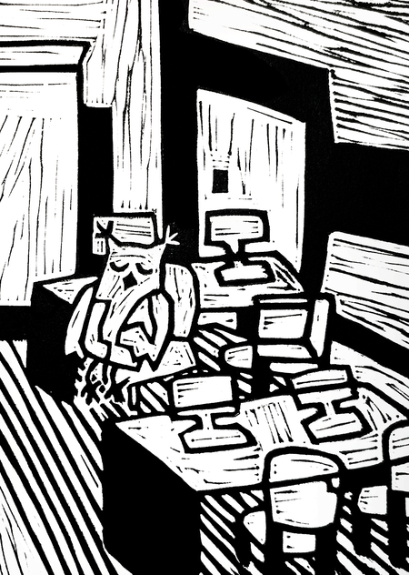 Серия линогравюр, посвященная бессонным ночам в корпусах Школы дизайна.