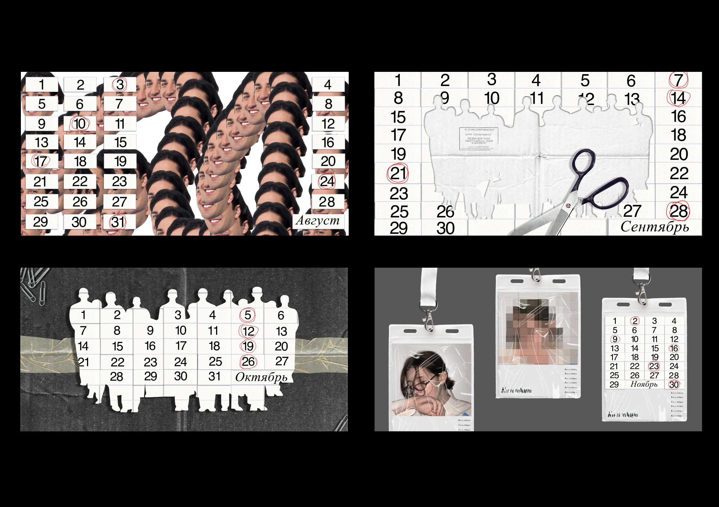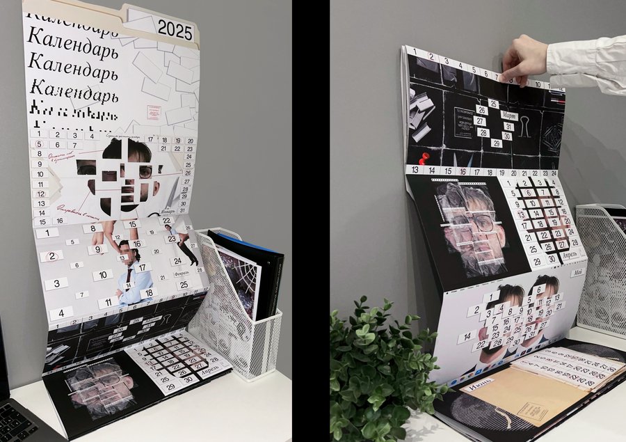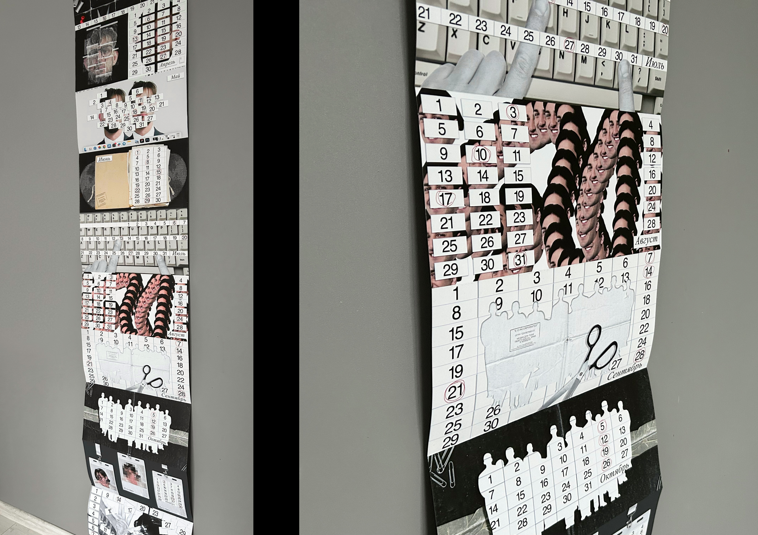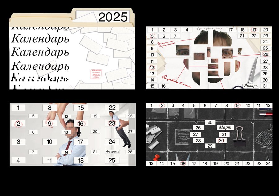 The calendar is a window to the world of the characters of the eternal office, performed using the typical attributes and materials of the site. The dates are cut out by a regular calendar. A new composition is collected every month.