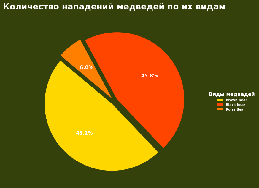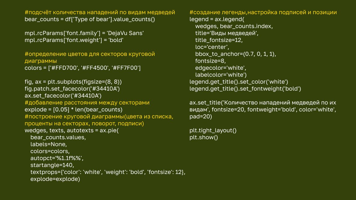 Чтобы посчитать количество нападений медведей определенного вида, достаточно было сгруппировать их в переменную bear_counts. С помощью Perplexity.ai я настроила цвета для сегментов и сделала список colors, к которому потом обращалась функция построения диаграммы.