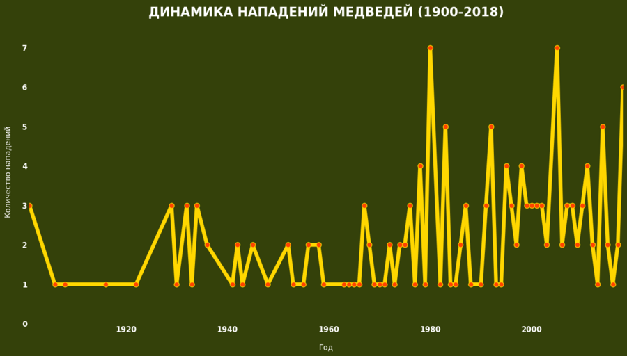 Линейный график демонстрирует распределение нападений медведей на людей по годам. Мы видим, что линия с явными перепадами; трагических случаев, к сожалению, становится в среднем больше с течением времени (после 1980 года).