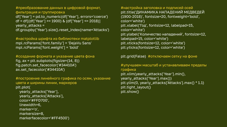 Для анализа и визуализации данных я выбрала линейный график (динамика нападений медведей с течением времени), круговую диаграмму (распределение количества нападений медведей каждого вида), столбчатую диаграмму (количество жертв в каждой возрастной группе) и тепловую карту (распределение количества нападений по месяцам и числу жертв).