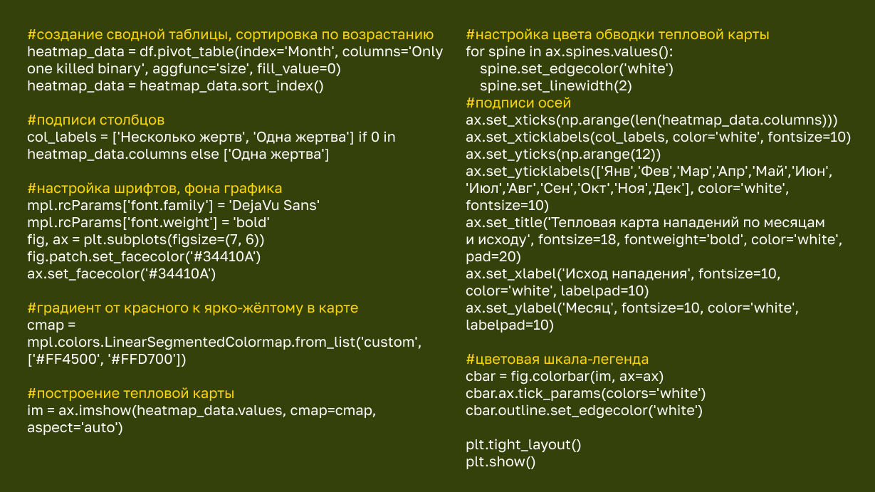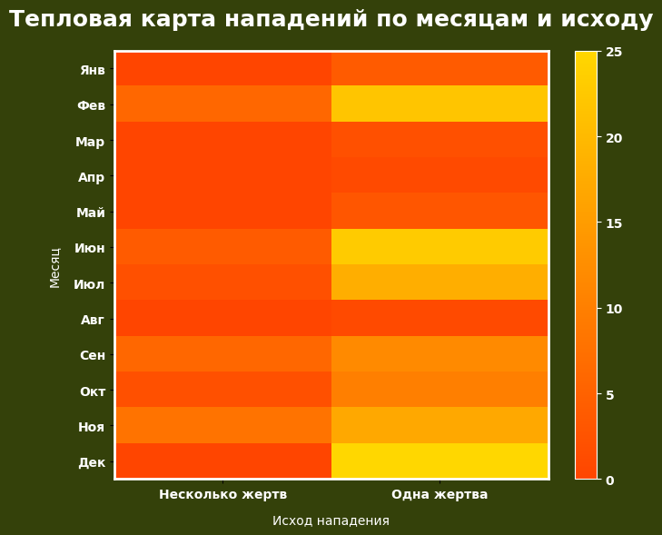 Для построения тепловой карты я снова обратилась к нейросети, чтобы грамотно создать сводную таблицу heatmap_data, где строки — месяца, столбцы — исход нападения, значения — количество нападений. Мне нужно было проверить, есть ли в колонке с информацией про количество жертв за раз ('Only one killed') значение 0 (то есть False, а значит жертв несколько), поэтому в переменной col_labels я задала условие, по которому формировались подписи для карты.