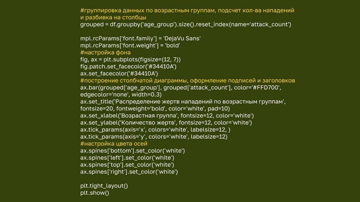 После проделанных манипуляций, я сгруппировала 'age_group' в переменную grouped. По алгоритму из предыдущих визуализаций настроила шрифты и цвет фона, а затем выполнила построение диаграммы, где по оси X — 'age_group', а по оси Y — 'attack_count'.