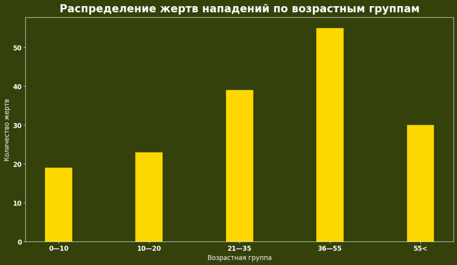 С помощью столбчатой диаграммы я хотела показать распределение количества жертв нападений по возрастам. Однако, если бы я брала каждый возраст, то график получился бы очень сумбурным, поэтому я решила создать новый признак 'age_group'.