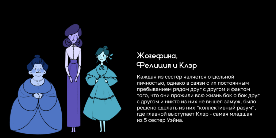 Семья Уэйнов: Кэролайн, Мари, Жозефина, Фелиция, Клэр, Эмили, кот Питер и Луис.