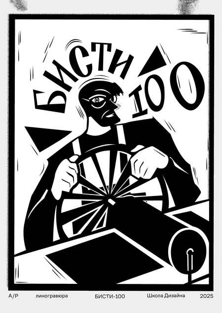 К 100-летию уважаемого графика, иллюстратора и шрифтового дизайнера Дмитрия Бисти я создала плакат, вдохновлённый процессом работы в технике высокой печати. На нём изображён сам Бисти за станком, отпечатывающий одну из своих работ. Подобно рекурсии, сам плакат будто отпечатан как несовершенная линогравюра, с большим усердием подражающая иллюстрациям художника.