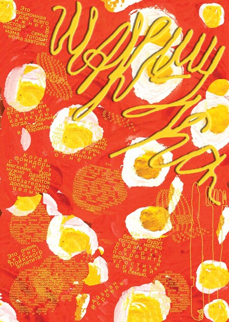 В следующем плакате задействованы пластилиновые шакшуки (из них выложено название блюда и использованы ингредиенты, «разбросанные» по листу), а также столовые приборы и рецепт — всё это работы мальчиков школы. В этом листе заложена идея разнообразия состава блюда: готовя шакшуку, мы мелко нарезаем все ингредиенты и засыпаем всё в одну сковороду.