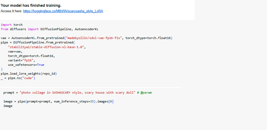 И наконец, можно было приступить к обучению модели, процесс которого занял около часа. После обучения необходимо было использовать созданный префикс для генерации последующих изображений в обученном стиле.