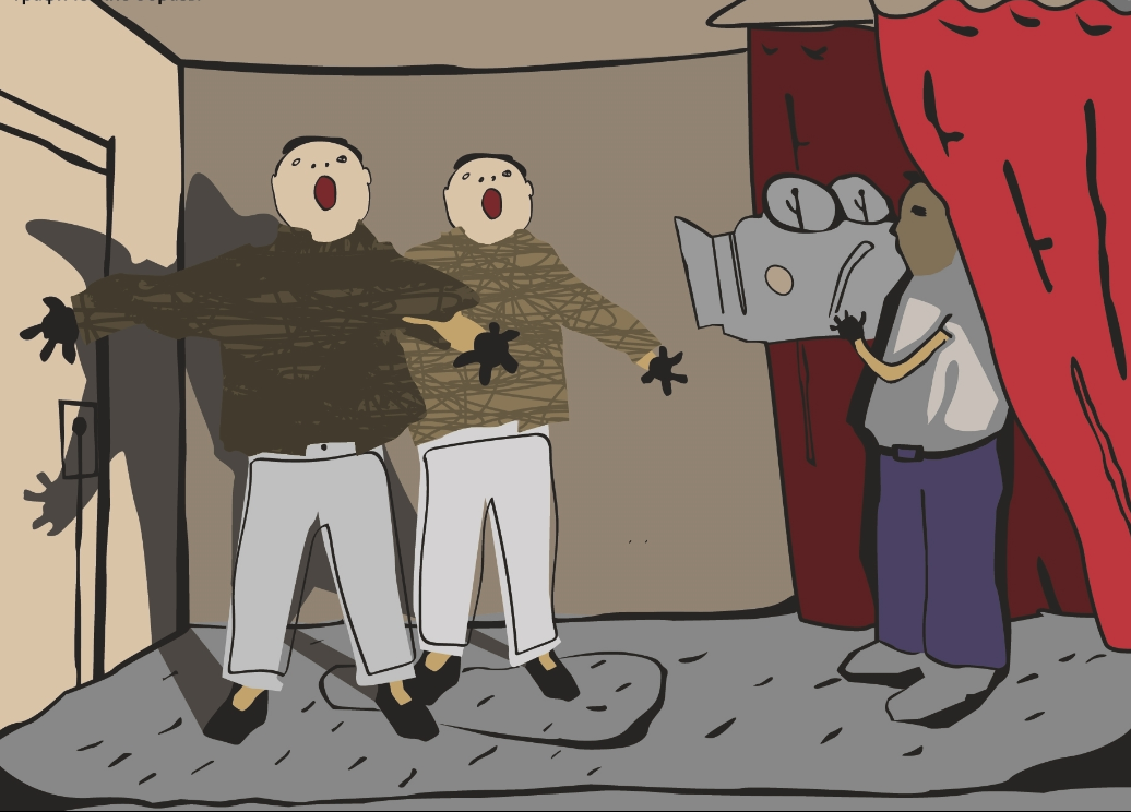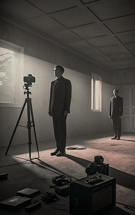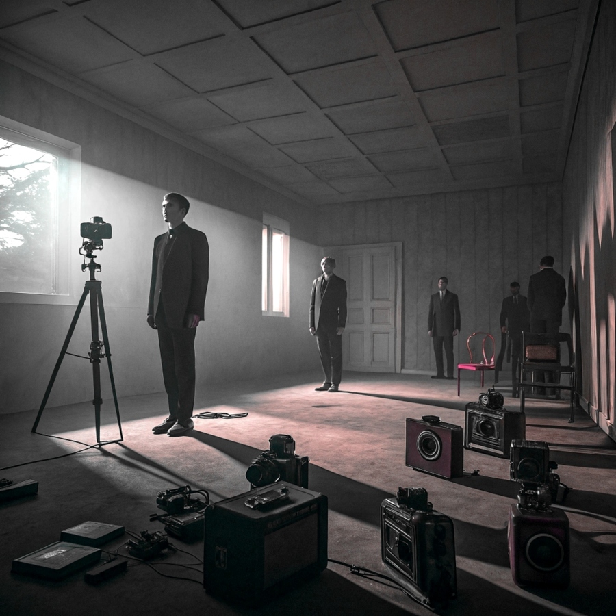 Make me a weird David Lynch-style space. where people are copied and special cameras and objects are used for this