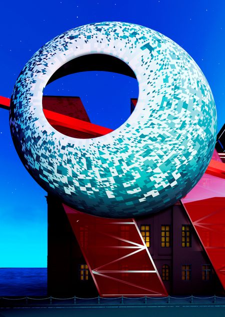За основную тему оформления фасада взята картина Ласло Мохой-Надя «Космический модулятор CH для R1». Конструкция выполнена из легких материалов. В ночное время система лазерных проекторов создает на высоте 50 метров голографические изображения основанные на работах Ласло Мохой-Надя и Александра Родченко.