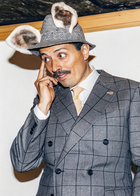 Promt: Create a photo of a man in a classic suit and a funny hat with ears.