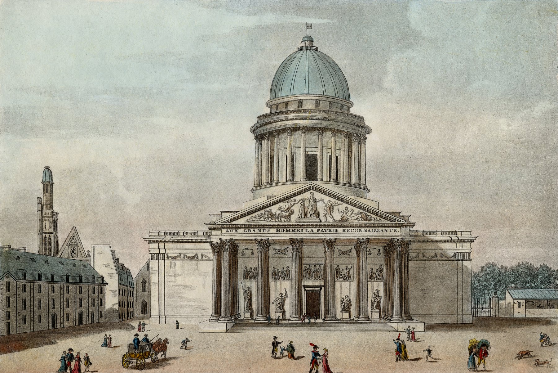 Пантеон был возведен в Латинском квартале Парижа по проекту Жака-Жермена Суффо. Строительство продолжалось с 1758 по 1790 год. Здание создавалось по приказу короля Людовика XV как Храм Святой Женевьевы, патронессы Парижа. Однако ни король, ни архитектор не дожили до окончания строительства, а начавшаяся Французская революция изменила назначение сооружения. В 1791 году было решено преобразовать храм в место упокоения останков выдающихся французов — по образцу римского Пантеона. Первым чести быть захороненным в Пантеоне удостоился знаменитый оратор граф Мирабо. Позже зданию дважды возвращали статус церкви, и лишь в 1881 году было вновь решено использовать его только в качестве мавзолея.