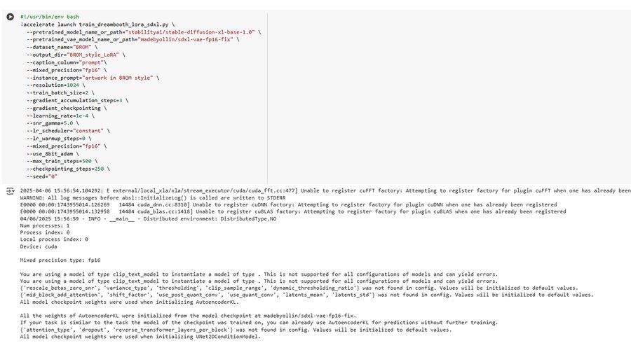 Выставленные параметры были следующими: —resolution = 1024 —train_batch_size = 2 —max_train_steps = 500 —checkpointing_steps = 250