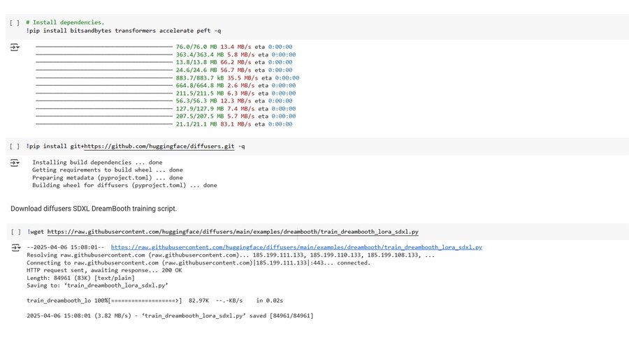 В качестве подготовительного этапа были проверка GPU, а также установка всех необходимых для обучения модели библиотек и скриптов (ditsandbytes, diffusers).
