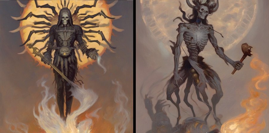 Prompt [6-7]: «artwork in BROM style, a smith-god of molten bronze, his skeletal hands hammering the sun into existence, his forge-heart burning behind ribs of blackened iron»