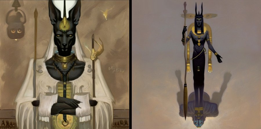 Prompt: «artwork in BROM style, a jackal-headed god, often seen as a protector of the dead with a black body symbolizing the afterlife»