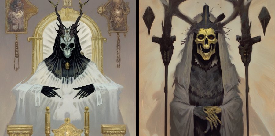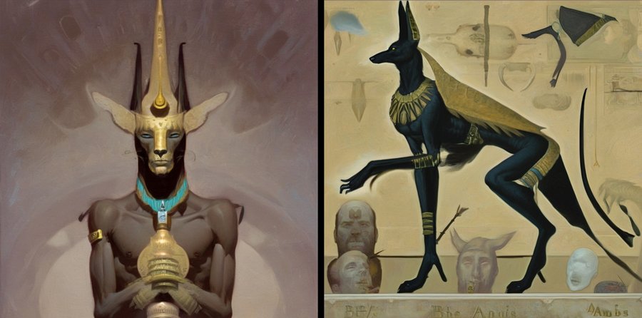 Prompt [1-2]: «artwork in BROM style, a towering, jackal-headed figure with obsidian-black fur, golden eyes that pierce the veil of death, and a skeletal frame draped in tattered funeral linens»