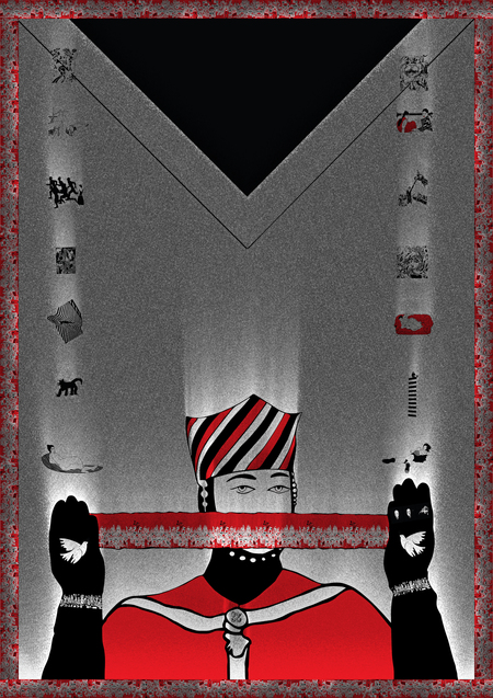 Представленный коллаж, использует различные методы и отсылки в искусстве, собирая концептуальный образ через цитату одного из кадров фильма «Цвет граната».