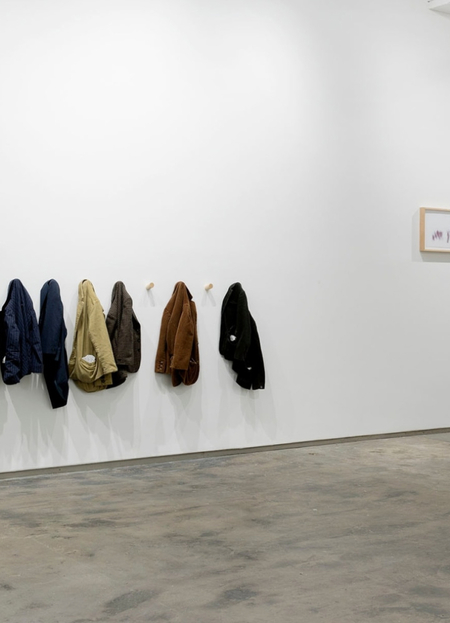 Инсталляция представляет собой ряд из восьми маленьких жакетов, их карманы оттянуты под тяжестью обернутых стихами камней