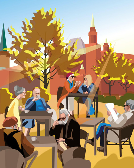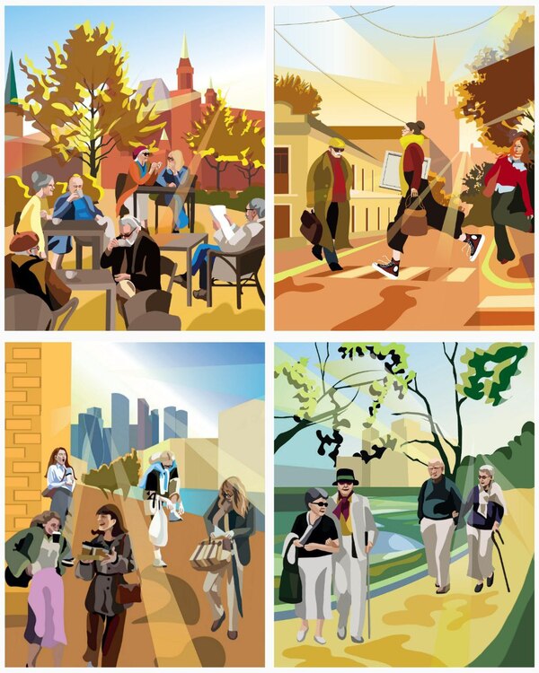 Серия иллюстраций «Утро в городе» исследует контраст между двумя ритмами жизни в Москве: ускоренным темпом молодости, когда нужно успеть все на ходу («Тверская просыпается», Москва-Сити «По дороге на работу»), и размеренностью старшего поколения, наслаждающегося спокойными моментами утра (Патриаршие пруды «Утренняя прогулка», «Завтрак на веранде» у Красной площади).