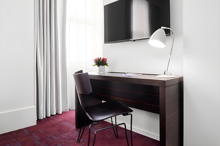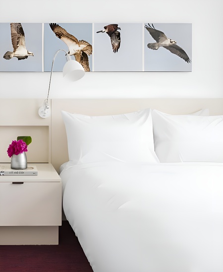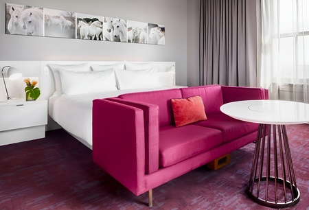 По сравнению с общественными пространствами номера выполнены более минималистично. Дизайн комнат выдержан в общей стилистике, номера практически идентичны. В них используется одинаковая мебель, цветовые сочетания и концепция. Интерьер комнат так же имеет акцентные деревянные настенные панели, но за счет светлых стен и потолков он выглядит свежее и спокойнее.