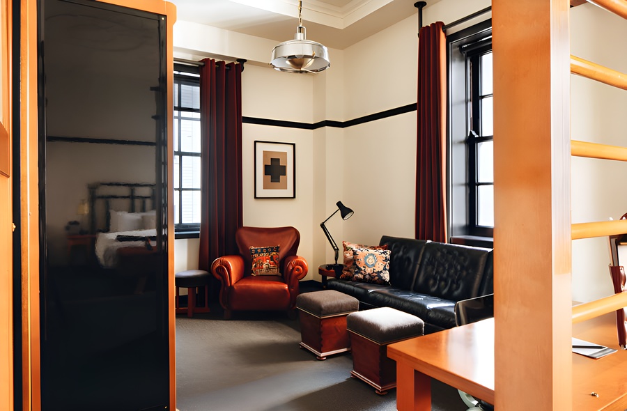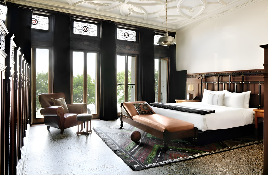 Номер «Founders Suite» располагается в бывшей библиотеке. В его распоряжении находятся три камина с завораживающей резьбой и местами встречающимися дьявольскими лицами. Светлая кожа в обивке мебели перекликается с красным цветом в фасаде здания. Практически в каждой комнате в окнах встречаются витражи XIX века.