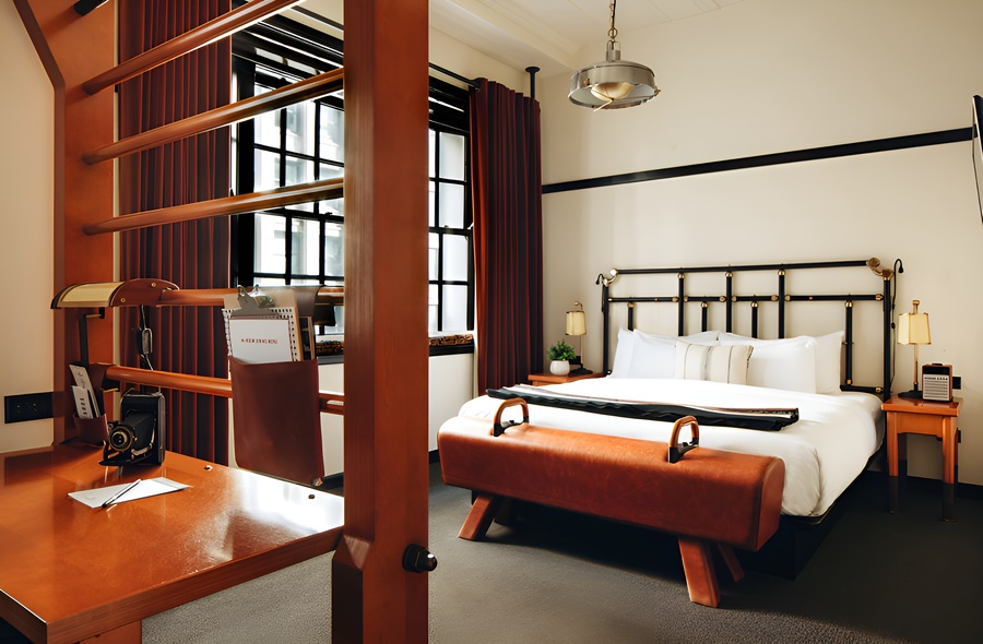 Латунные кровати — это современная интерпретация кроватей XIX века. Тема спорта в номерах раскрыта еще больше: своеобразная кушетка в виде гимнастического коня, деревянные спортивные турники, лесенки работают перегородками и перекладинами для вещей.