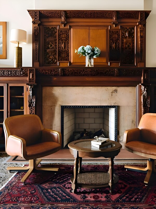 В гостиной много деревянных конструкций с активными формами, барельефами. Декором служат многочисленные картины и винтажные светильники. Интерьер соответствует эпохе архитектуры. Акцентом так же являются многочисленные камины. В Интерьере удивительно гармонично сочетаются венецианская готика, спортивный стиль и современность.