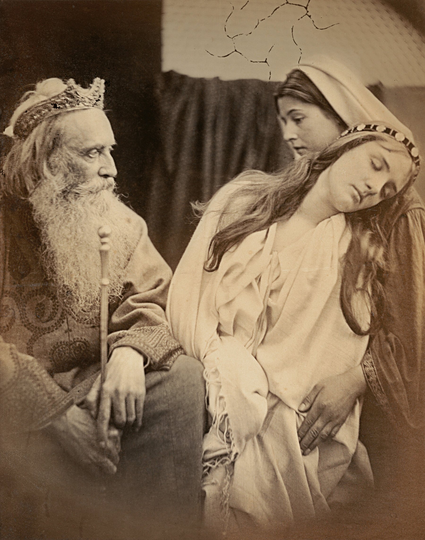 На снимке: сцена одного из театральных представлений, которые устраивались в доме семьи Камеронов на острове Уайт. Сюжет снимка Джулии отсылает к известному библейскому сюжету, когда царица Эсфирь падает в обморок во время встречи с персидским царём Артаксерксом. Она просит Артаксеркса пощадить евреев, которых он приговорил к смерти. Мы видим импровизированные костюмы, фон и реквизит, включая кочергу для камина, которая имитирует скипетр царя. Снимок 1865 года.