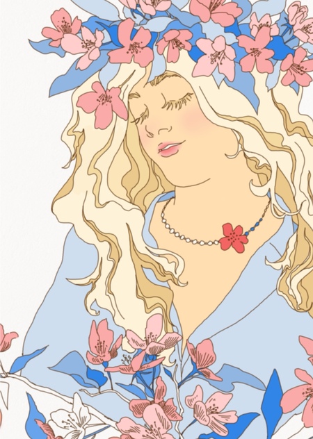 Моей задачей стало создание серии иллюстраций, которые можно было бы потом перенести на стену студии как декор. Главный мотив — современные девушки в стиле Боттичелли или Мухи. Важно было использовать фирменные цвета и изобразить не только девушек, но и ветку яблони — под окнами студии растет яблоня, которая стала местной достопримечательностью, и Алина хотела, чтобы в студии было как бы ее продолжение.