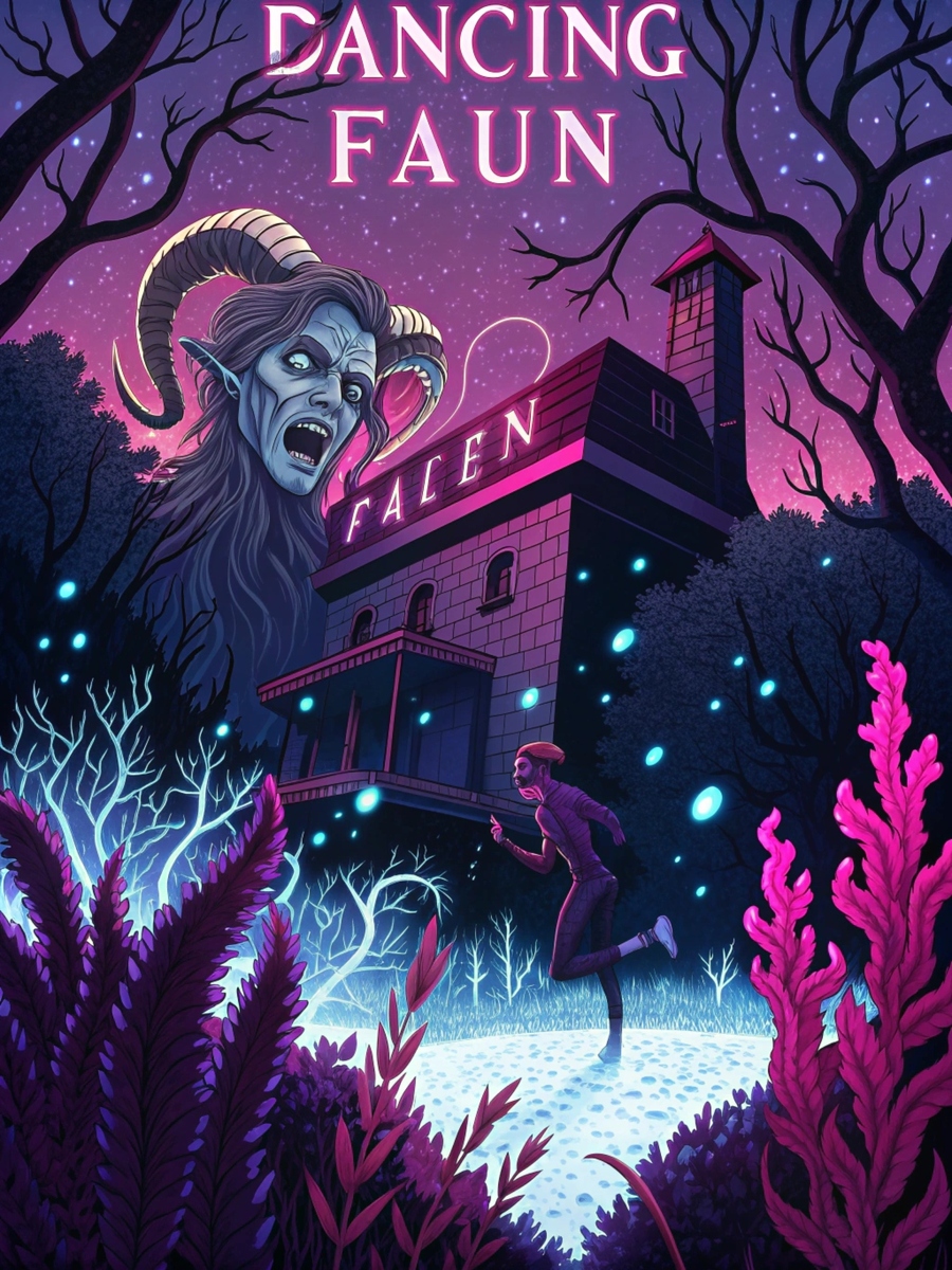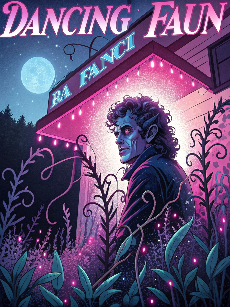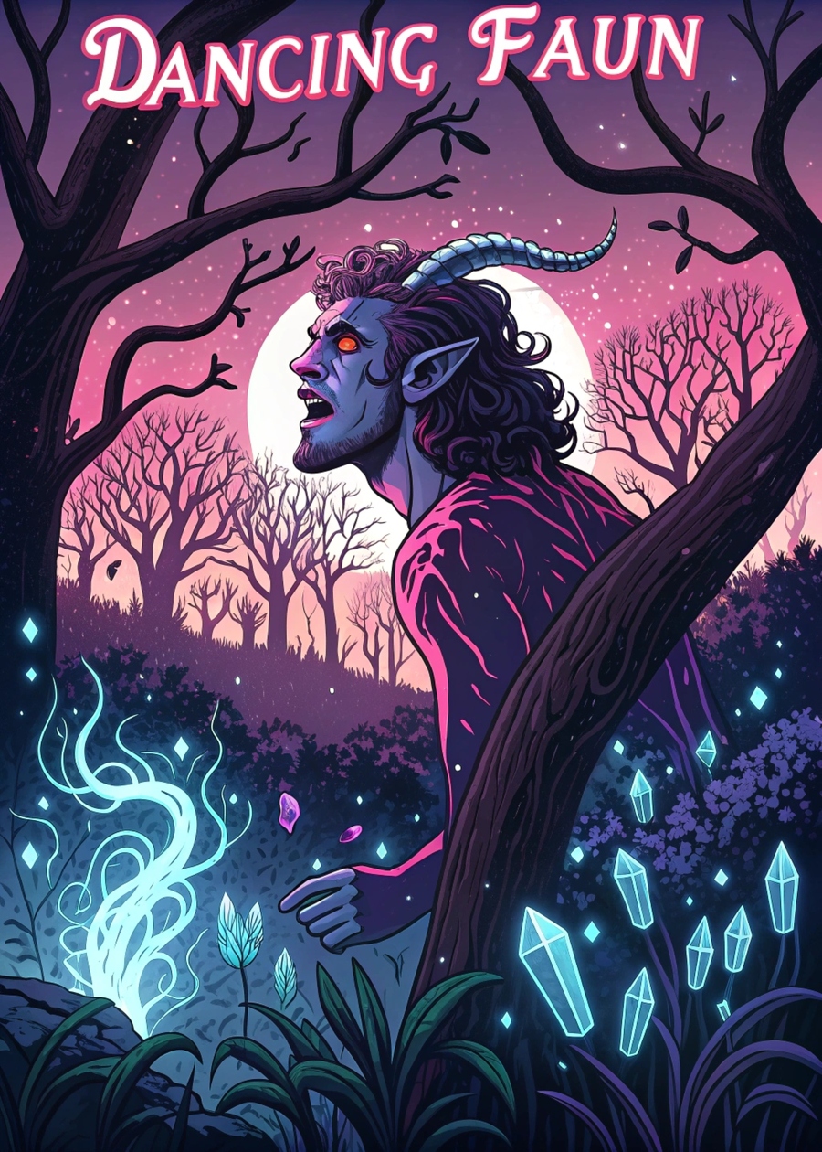 Промт: Poster for the Bar called dancing faun, bright and dark colors pink purple blue, horror atmosphere, curling plants, crystals