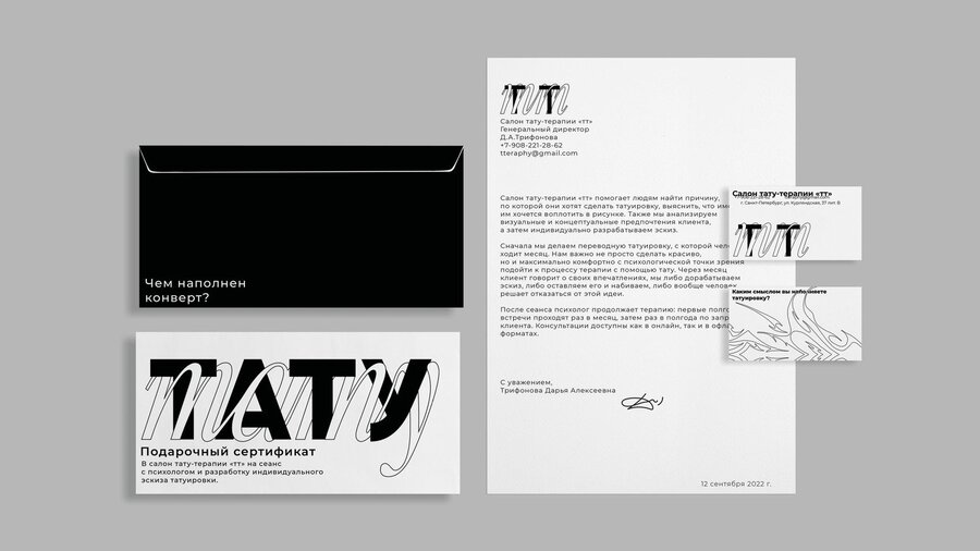 В процессе работы я обновила фирменный стиль салона тату-терапии, изменила нейминг, продукцию, создала концепцию пространства и рекламных материалов.
