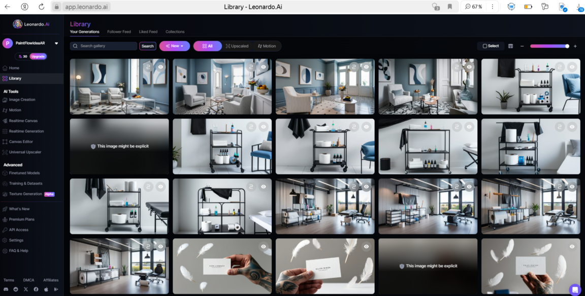 Здесь я попробовала сделать генерации через recraft, но он по какой-то причине всё сводил к стилю 2D иллюстрации, поэтому я перешла в leonardo.ai. Путём смешения разных стилей внутри нейросети, добавления референсов и длинных веток промптов, я пришла к приемлемому результату.